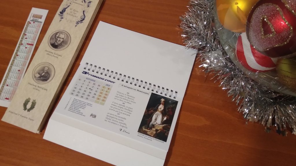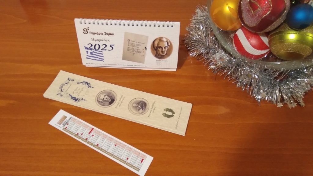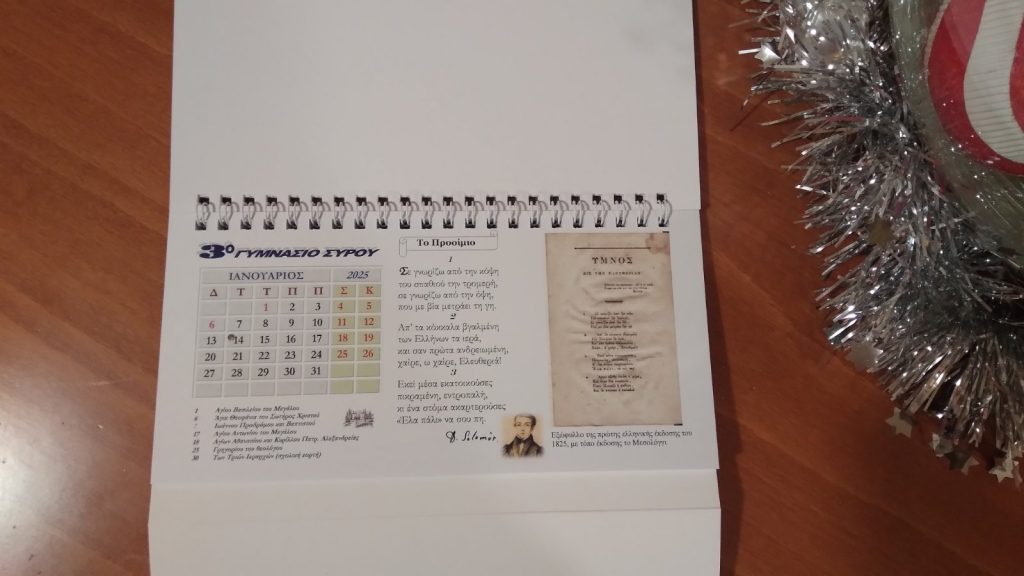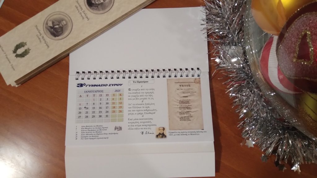 Το σχολείο μας συνεχίζοντας την, επί σειρά ετών, παράδοση της δημιουργίας του ετήσιου θεματικού ημερολογίου και με αφορμή τα διακόσια περίπου χρόνια από την συγγραφή του Εθνικού Ύμνου ολοκλήρωσε κ’ εφέτος και παρουσιάζει το Ημερολόγιο του 2025 με τίτλο «Ο Εθνικός Ύμνος». Όποιος ενδιαφέρεται μπορεί να το προμηθευτεί από το σχολείο μας.